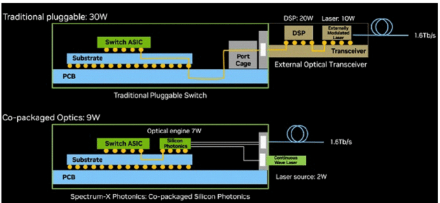 在 GTC25 上,Nvidia 推出了首款搭载 CPO 的横向扩展交换机。其节能特性可实现更高的 GPU 密度——在相同的数据中心功率范围内,GPU 数量最多可增加 3 倍。