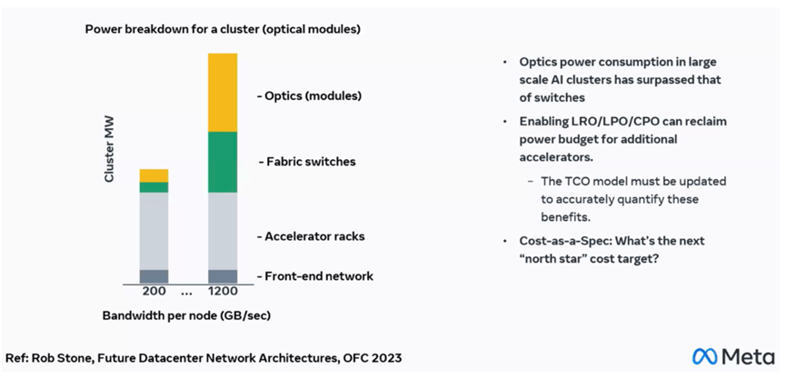 为了满足LLM的增长和吞吐量需求★◆◆◆◆,横向扩展网络中的数据速率不断提升,网络功率已超过加速器机架功率。据Nvidia称,从可插拔光模块转换为CPO(共封装光模块)可以大幅降低1.6Tbps链路的光模块功率◆★,从30W降至9W。