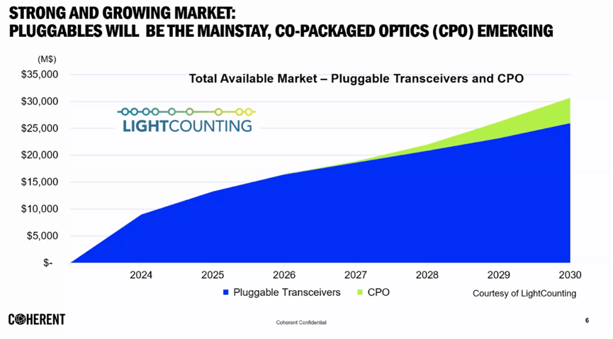 预计未来几年内,规模化网络将开始向 CPO 过渡,并在 2030 年代大规模替换可插拔式光模块。到 2030 年,CPO 市场规模将从目前的零增长到 50 亿美元。博通、Marvell◆◆、Ayar Labs、Celestial AI 和 Lightmatter 等早期进入者以及 Coherent 等激光器供应商都将从中受益。